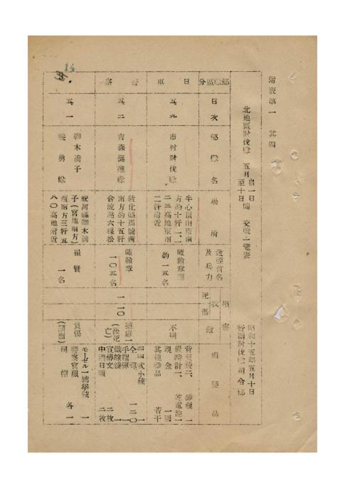北地区讨伐队5月1日至10日交战一览表 1940年5月10日 野副讨伐队司令部 |