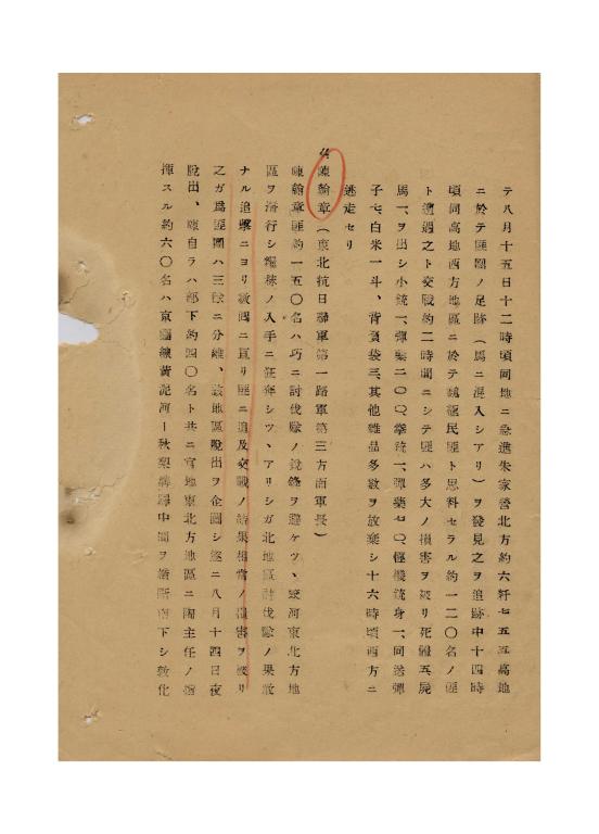2023年6月14日,陈翰章烈士诞辰110周年之际,吉林省档案馆公布了65件陈翰章烈士战斗档案。后连同研究人员撰写的5篇文章,汇成《赤胆忠诚——陈翰章战斗档案及研究》一书。战斗档案真实记录了1936年8月至1940年12月8日陈翰章烈士率部与日伪军警展开的81次战斗及活动情况,全面展现了陈翰章烈士戎马岁月中坚定的理想信念和顽强的斗争精神。现选编部分档案(附中文译文),以飨读者。