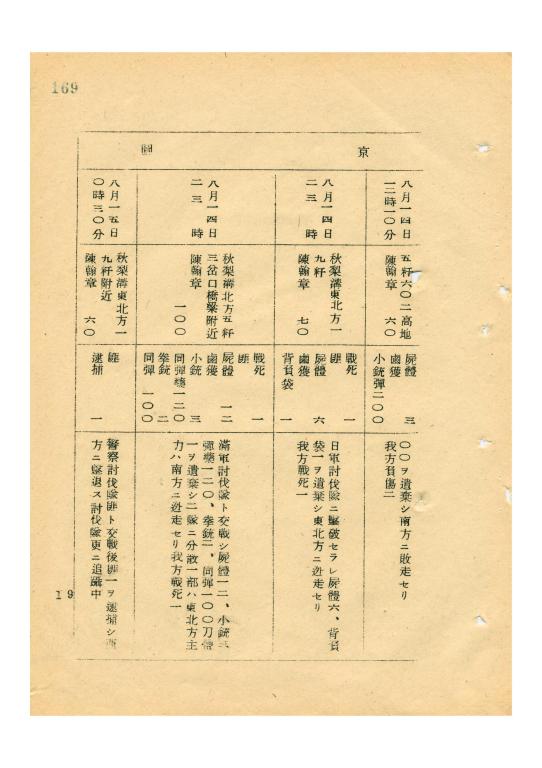 北地区讨伐队 8月11日至20日交战一览表 1940年8月20日 野副讨伐队司令部 |