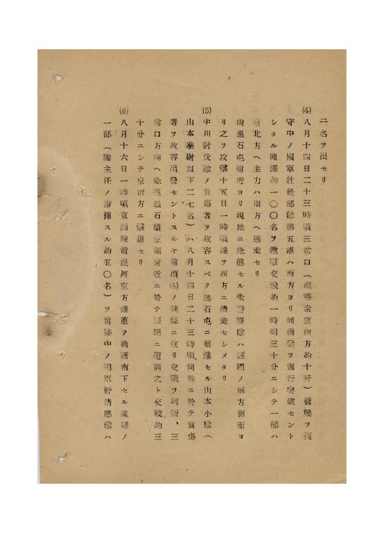 (5)山本小队(山本准尉为首的27人)欲前往黑石屯,收容中川讨伐队的伤员。8月14日23时在当地即将出发收容伤员时,听到(4)的枪声,判断交战了,便紧急出动前往三岔口方向,在黑石岭东侧附近与该部队遭遇,与之交战,约30分钟后,该部队向东南部撤去。