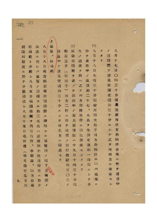 行动概要:陈翰章部队与满军讨伐队交战,遗弃尸体12具、步枪3支、步枪子弹120发、手枪2支、手枪子弹100发、刀带1个。该部队分散为2队,一队向东北部撤退,主力向南部撤退。