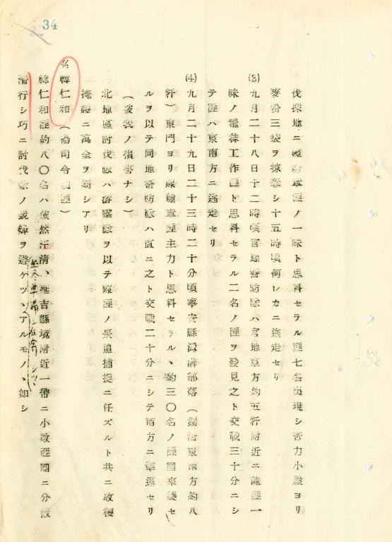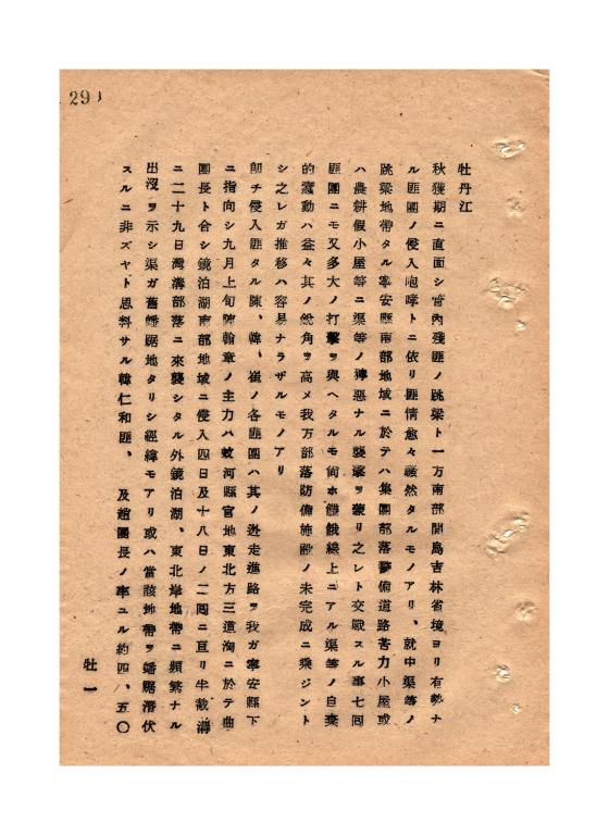 即,进入本省的陈翰章、韩仁和、崔贤各部队会逃往宁安县内。9月上旬,陈翰章主力在蛟河县官地东北部三道沟与曲团长会合,进入镜泊湖南部地区,4日及18日2次袭击了半截沟,29日袭击了湾沟部落,此外还频繁出没于镜泊湖、东北岸地带。由于这里曾是其原活动地,可能他们将潜伏在该地区活动。