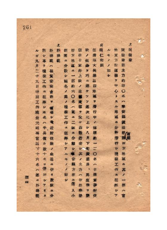 陈翰章部队主力约40人潜伏在敦化东南部地区,巧妙地寻找讨伐队的间隙,于8月底横穿京图线大桥附近北上,潜入官地东部四道沟偏僻地带,随后又联合潜伏在官地东北部地区的曲团长及分散行动的残存力量等,企图从额穆索东部地区北上至西北部五常方向,或者从东北部塔拉站方向逃入宁安县方面的某处。因此,要严密警戒陈翰章部队今后的动向。