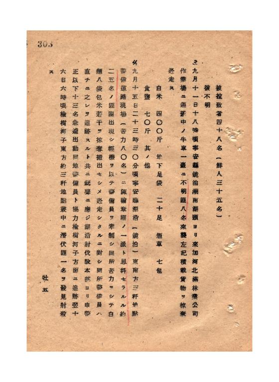 4.9月15日23时30分左右,疑似陈翰章部队一部约25人出现在宁安县镜泊湖沿东南部3公里的警备道路现场(苦力80人),用轻机枪牵制住警备员,获取8袋白面及若干苞米,让现场的苦力帮忙搬运后撤退。于是,该地警备员立刻追寻其踪迹,与此同时,湖沿讨伐队本部听到枪声后,派遣申警正及属下共13人出动,协助该地警备员,一直追击到榆树河子一带。第二天(16日)6时左右,在榆树河子东部约3公里处发现并射杀了潜藏在草丛中的1人。