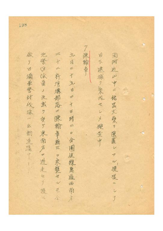 2023年6月14日,陈翰章烈士诞辰110周年之际,吉林省档案馆公布了65件陈翰章烈士战斗档案。后连同研究人员撰写的5篇文章,汇成《赤胆忠诚——陈翰章战斗档案及研究》一书。战斗档案真实记录了1936年8月至1940年12月8日陈翰章烈士率部与日伪军警展开的81次战斗及活动情况,全面展现了陈翰章烈士戎马岁月中坚定的理想信念和顽强的斗争精神。现选编部分档案(附中文译文),以飨读者。
