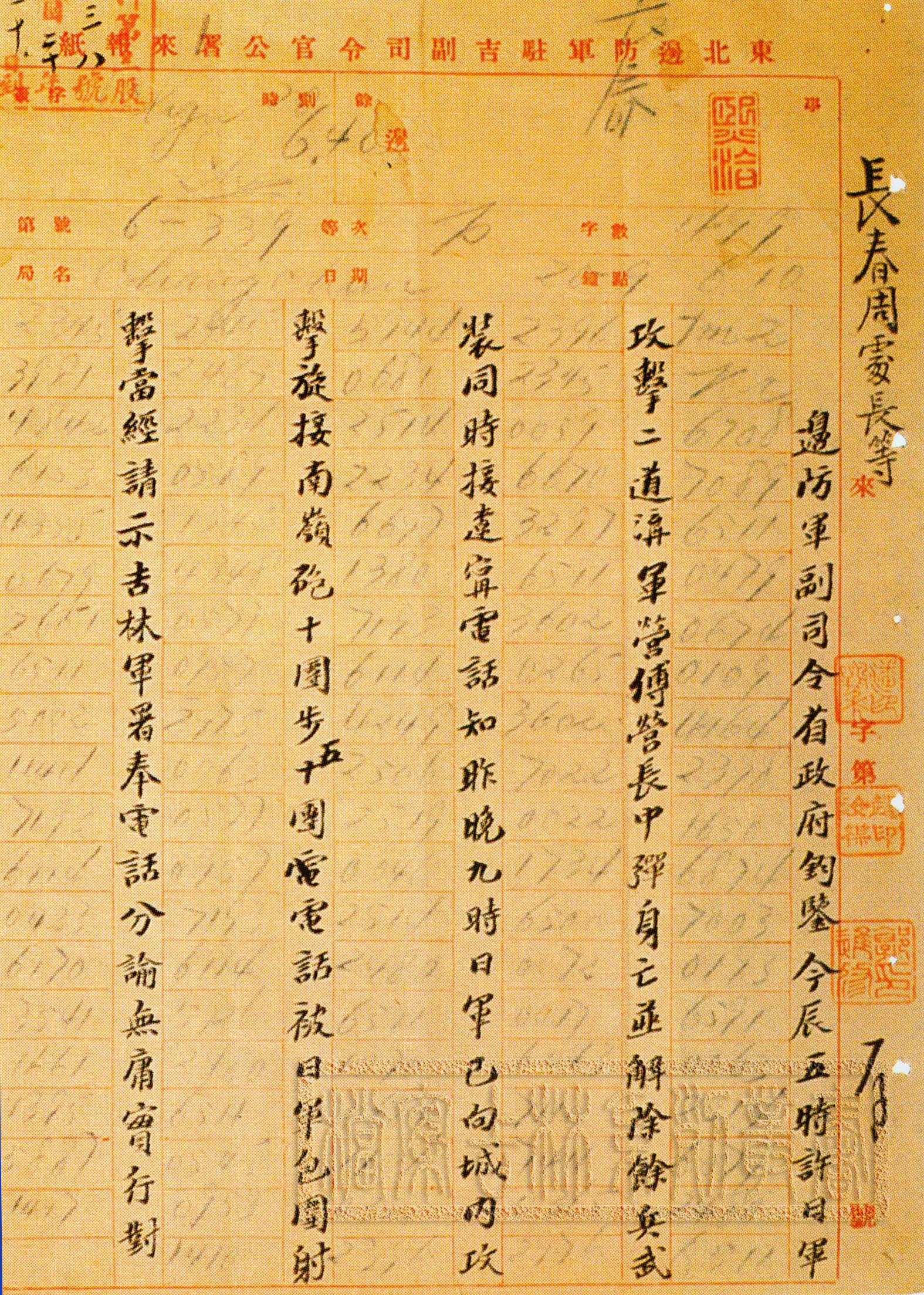 九一八事变后长春市政筹备处于19日6点40分发往省城吉林的电报,报告了二道沟兵营被日军攻占的情况
